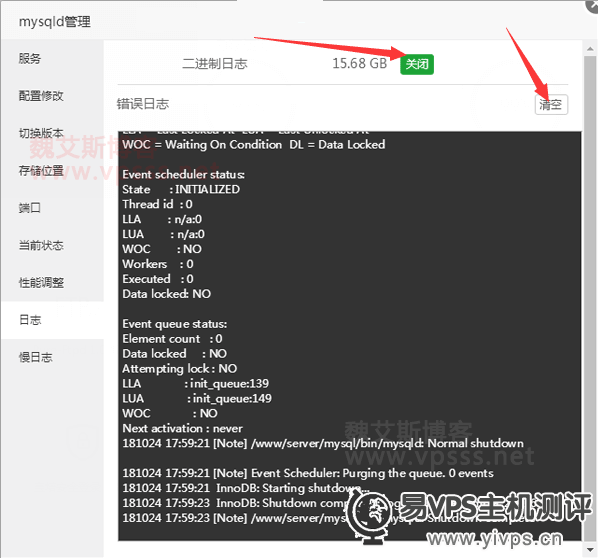 3、在后台首页,软件点击 MySQL,弹窗中选择日志,会看到错误日志,我这个宝